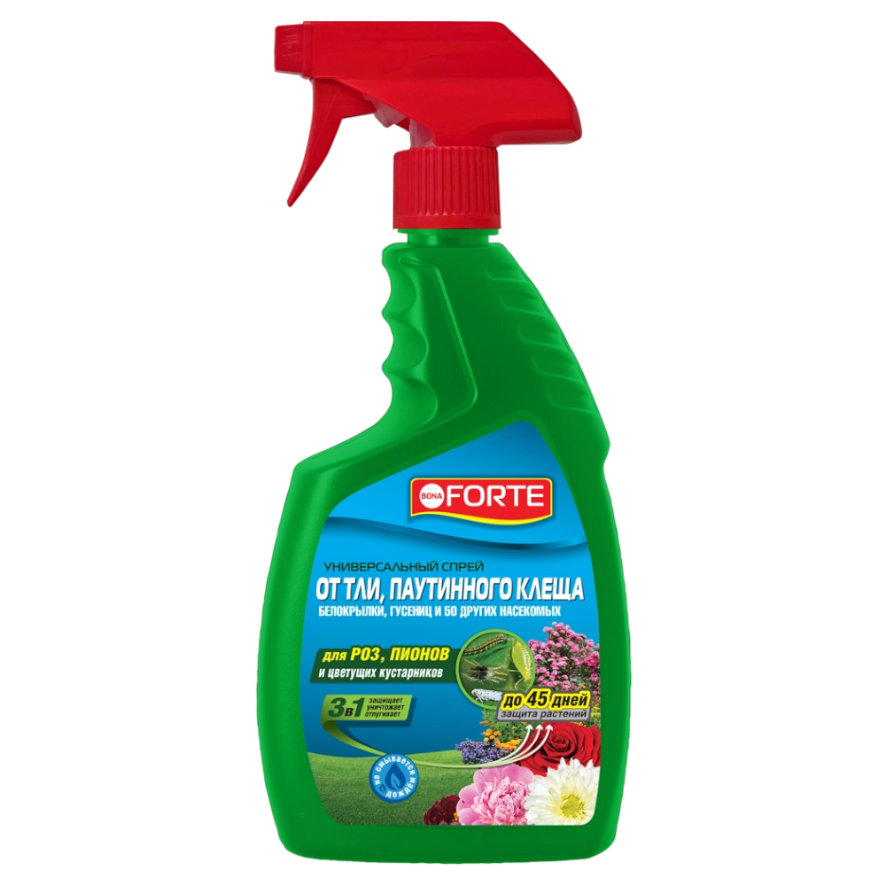 Спрей от комплекса вредителей Бона Форте 0,75л. Уничтожает различные виды насекомых-вредителей. Эффективен от тли, белокрылки, паутинного клеща, трипсов, гусениц и других насекомых.