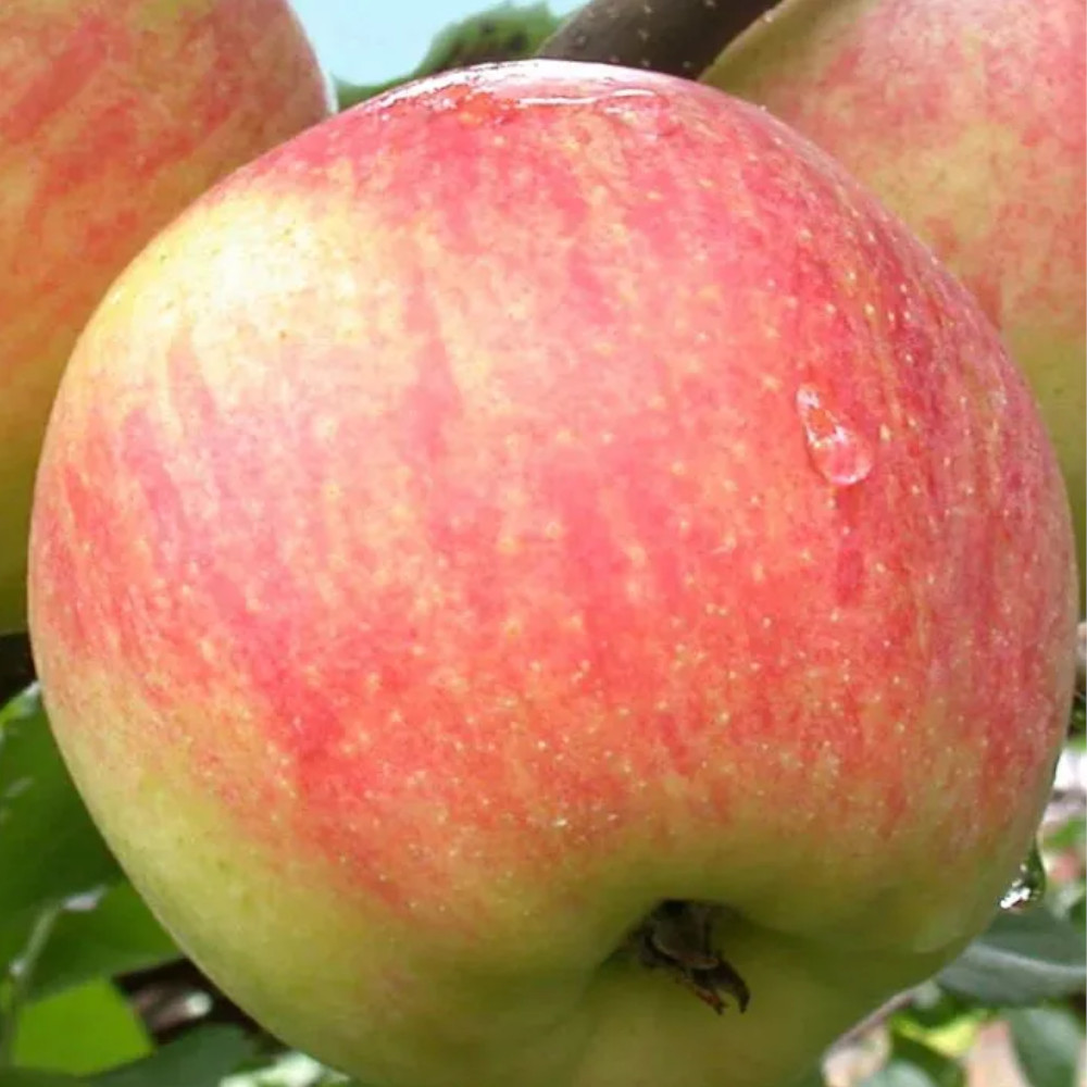 Плоды крупные 300 гр. Окраска желтоватая, красный румянец, форма округлая. Мякоть сочная, мелкозернистая, белая, сладкая. Дерево среднего роста, плодоносит ежегодно.