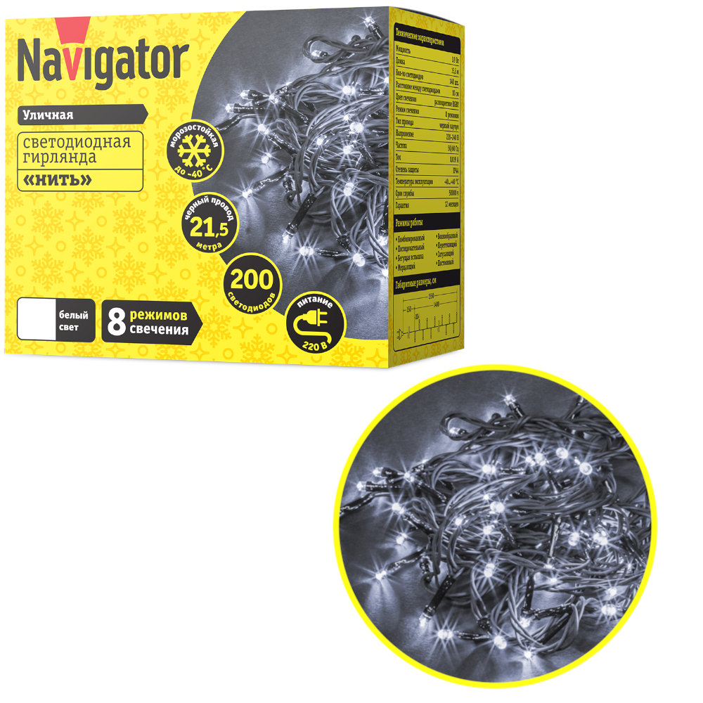 Количество ламп 200 шт. Цвет свечения белый. Цвет шнура черный. Длина изделия 21,5 м. Режим свечения 8 режимов (комбинированный/волнообразный/последовательный/перетекающий/бегущая вспышка/затухающий/мерцающий/постоянный). Изображения товаров на фотографиях, представленных на сайте, могут незначительно отличаться от оригиналов.