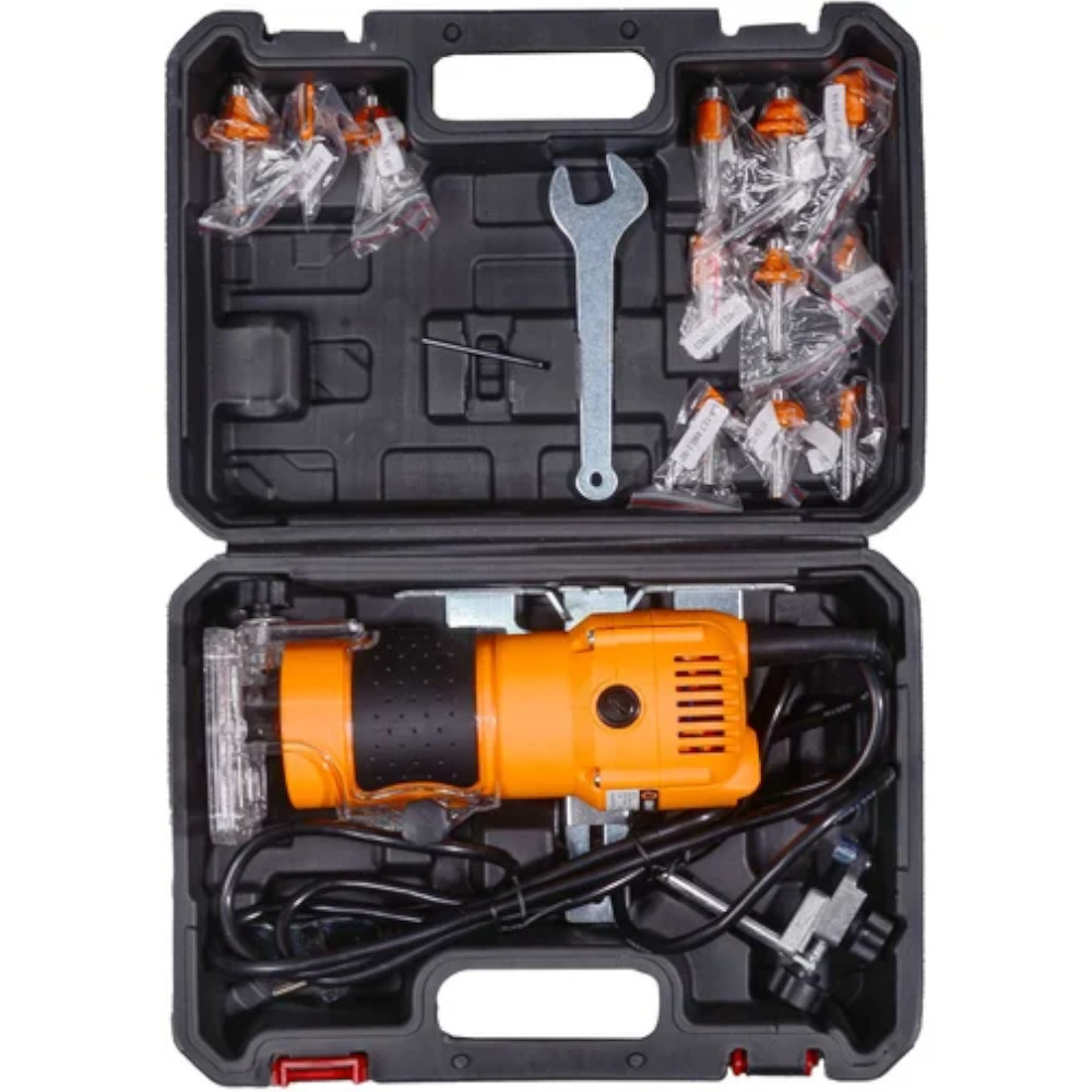 В комплекте с фрезером идет набор из 12 фрез, что позволяет сразу приступить к работе и не тратить время на поиск дополнительных инструментов.