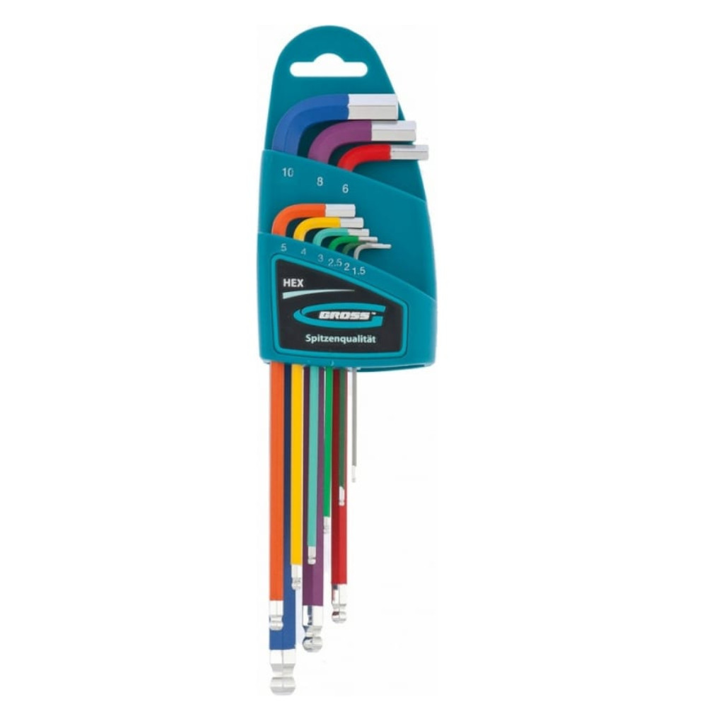 Набор имбусовых ключей с шаром HEX 1,5–10 мм GROSS 9 шт. 16400 - комплект из 9 экстра-длинных ключей с шаром для откручивания и закручивания резьбовых соединений. Магнит обеспечивает надежное соединение инструмента с крепежом. Ключи выполнены из стали S2 твердостью 52-56 HRC и защищены от коррозии. Разноцветное покрытие и маркировка размера позволяют ускорить поиск нужного ключа.