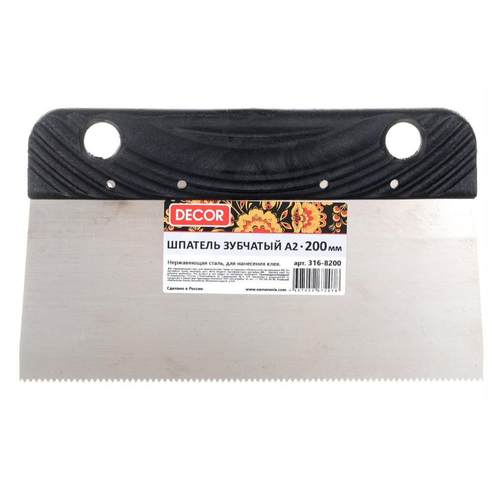 Шпатель DECOR зубчатый А2 длина 200 мм, ширина 80 мм, толщина 0,45 мм, зуб 2 мм, пласт. ручка, нерж. сталь, 316-8200 удобен для нанесения клеевых составов. Имеется удобная рукоять.