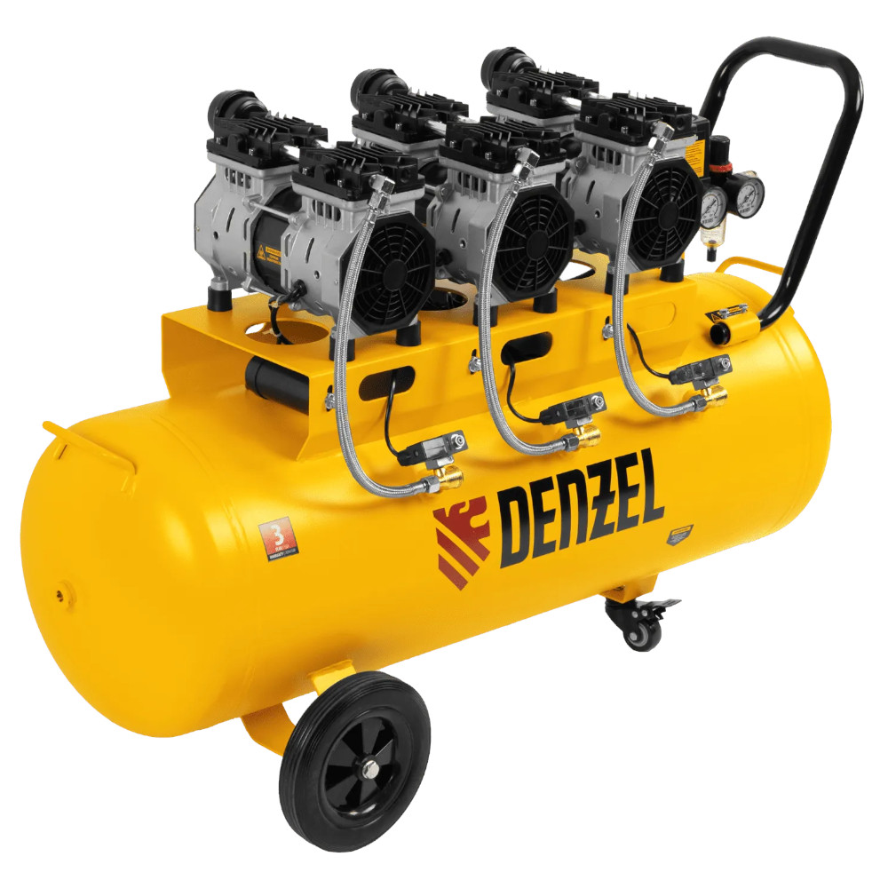 Компрессор безмаслянный малошумный DLS 1800/100,1800 Вт, 3х600, 100 л, 345 л/мин// Denzel предназначен для обеспечения пневмоинструмента сжатым воздухом, подаваемым под давлением до 8 бар. Позволяет подключить пневматический заклепочник, дрель, шлифмашину и т.д. Оптимален для работы с краскопультом и для продувки электронных компонентов, т. к. в сжатом воздухе отсутствуют частицы масла. Компрессор пригодится в мастерской, гараже, на строительной площадке.