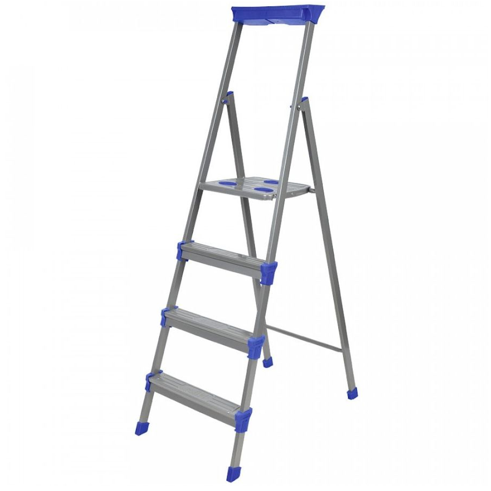 Стремянка применяется в домашних условиях. Оснащена пластиковыми заглушками, которые не повреждают напольное покрытие.