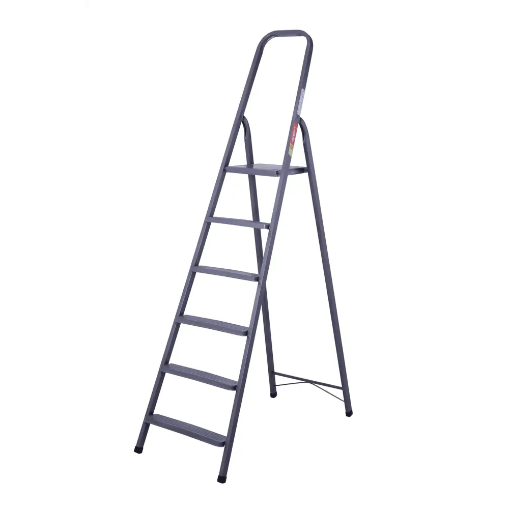 Стремянка стальная 6 ступеней MegArsenal надежная фиксация в рабочем положении — на верхней площадке имеются специальные зацепы, опоры дополнительно удерживаются страховочными лентами.
