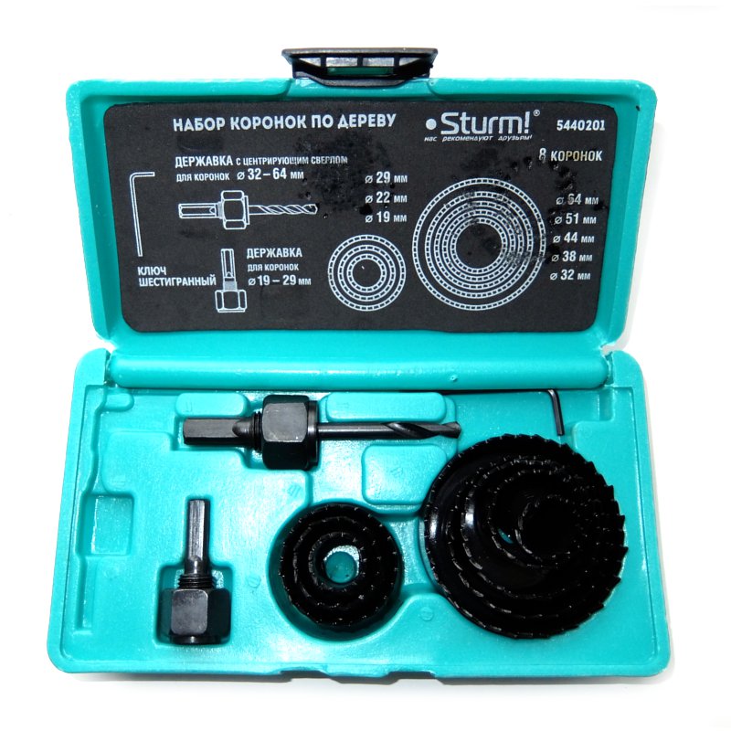 Набор коронок Sturm 5440201 предназначен для выполнения отверстий в древесине различных диаметров. В наборе коронки диаметром: 19 мм, 22 мм, 29 мм, 32 мм, 38 мм, 44 мм, 54 мм, 64 мм. Зубья пил закалены и усилены. Продукты пиления легко удаляются через боковую прорезь. В комплекте поставляются две державки с центрирующим сверлом и шестигранный ключ.