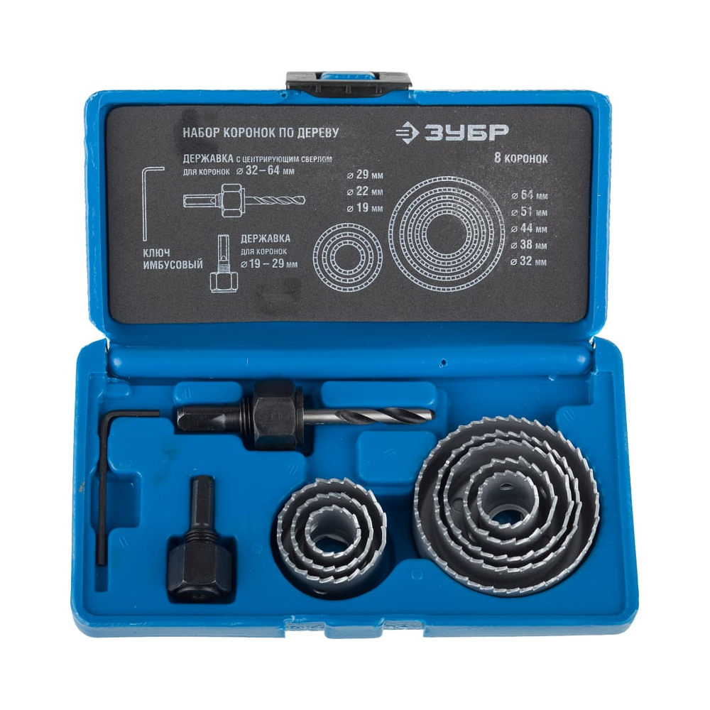 Набор ЗУБР "ЭКСПЕРТ"Коронки по дереву 19-64мм,держ. 19-30мм,держ.с опорн.сосн.,ключ имбус.2,5мм,11пп