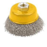 Корщетка-чашка используется для шлифовальных и обдирочных работ в угловых шлифовальных машинах. Оснастка крепится к инструменту при помощи гайки М14. Рабочая поверхность щетки — волнистая латунированная проволока.