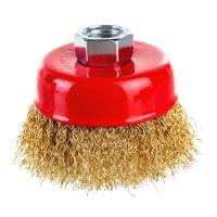 Корщетка-чашка 39265 используется для шлифовальных и обдирочных работ в угловых шлифовальных машинах. Оснастка крепится к инструменту при помощи гайки М14. Рабочая поверхность щетки — волнистая латунированная проволока.