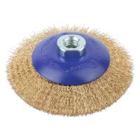 Щетка для УШМ, тип ''Тарелка'', посадка М14. Предназначена для очистки различных металлических и деревянных поверхностей, снятия толстого слоя ржавчины, удаления лакокрасочных покрытий, заусенцев и окалины, обработки сварных швов, различных загрязнений. Тип ''Тарелка'' оптимально подходит для обработки углов, пазов, изгибов и других труднодоступных участков. Щадящая зачистка, латунированная проволока 0,3 мм.