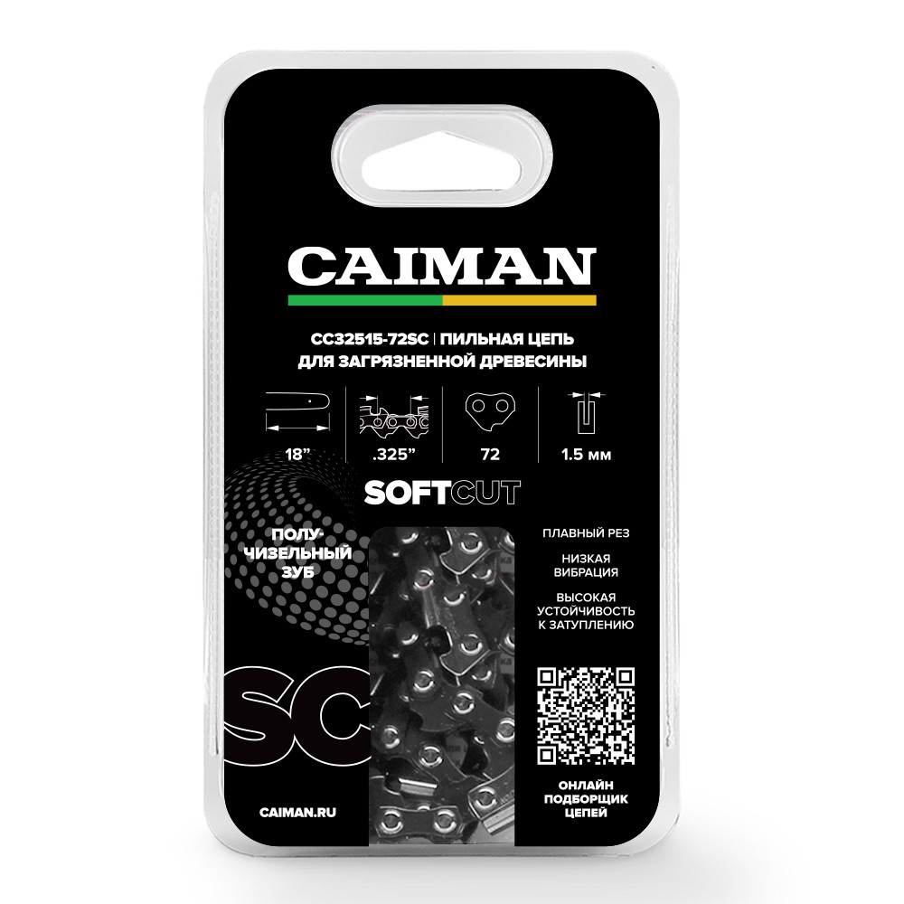 Профессиональная цепь для бензопил CAIMAN CC32515-72SC: длина 18", шаг 0.325", толщина направляющего звена 1,5 мм, 72 звена, получизель. Клиновидный ограничитель глубины пропила для снижения вибрации, дополнительные амортизирующие звенья для снижения силы обратного отскока. Масляные каналы на хвостовиках звеньев для уменьшения трения и равномерного распределения масла по всей длине шины. Указательная риска на верхней грани режущего зуба упрощает заточку и служит индикатором износа цепи.