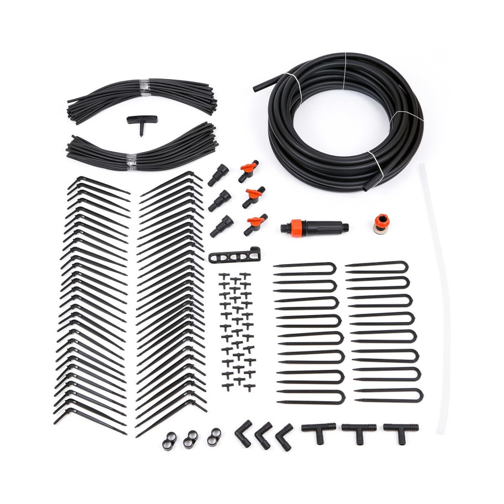 штуцер присоединения к ёмкости, шланг магистральный, 18 м, трубка уровень прозрачная, 1 м, подвес для трубки уровня, 1 шт, шланг подающий, 40см, 60 шт, капельницы, 60 шт, тройник малый, 30 шт,-кран, 3 шт, уголок для магистрального шланга, 3 шт,тройник большой,3 шт, заглушка для магистрального шланга, 3 шт, прижим для магистрального шланга, 18 шт, шило для магистрального шланга, 1 шт, штуцер 1/2" ( для соединения с ёмкостью), 1 шт, штуцер 3/4" (для монтажа фильтра), 2 шт, фильтр тонкой очистки, 1 шт.