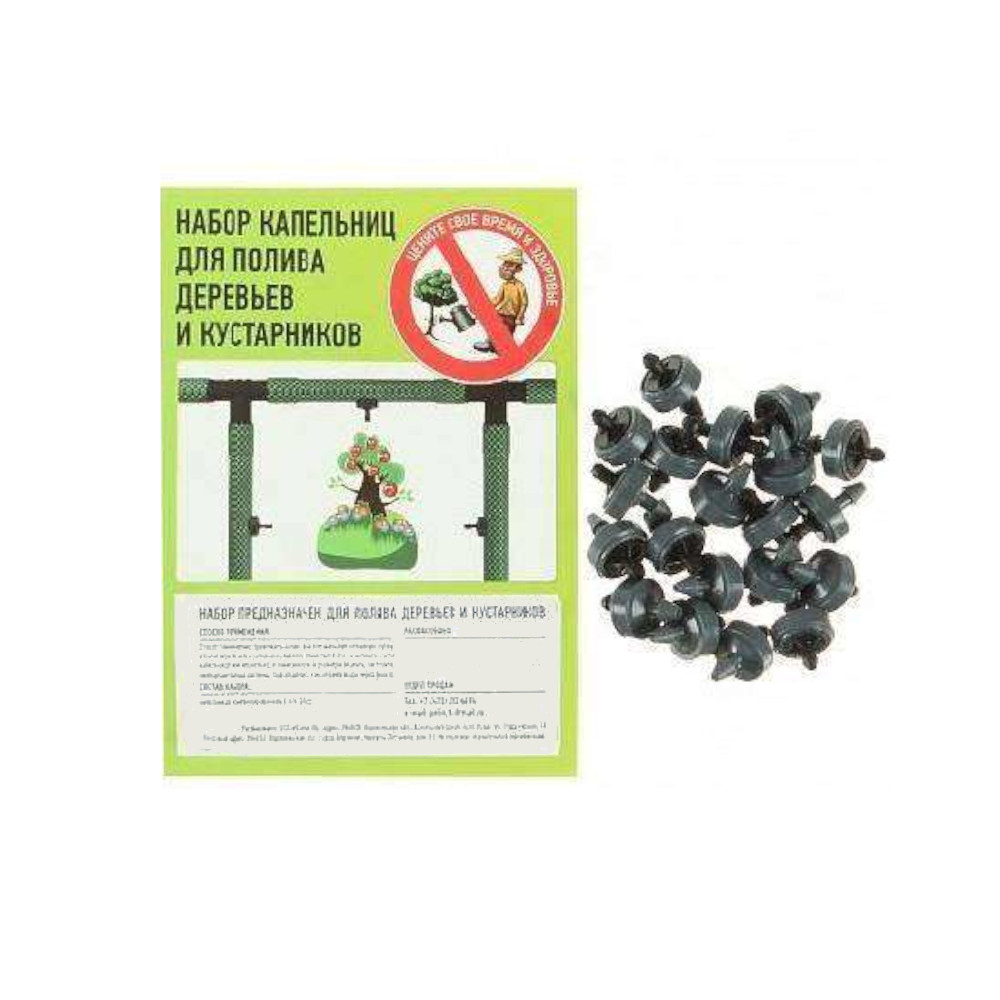 Набор предназначен для капельного полива деревьев, кустарников, цветов и прочих культур. Скорость полива 5 л/ч., при давлении 1 Атм. Монтаж возможен в шланг или садовую трубку, проложенную вдоль посадок, перед монтажом плотно скрутить обе половины капельницы. В месте полива в шланге или садовой трубке делается отверстие шилом, в него вставляется капельница заостренной стороной. Капельница разборная, в случае засорения раскрутить, промыть, собрать заново.