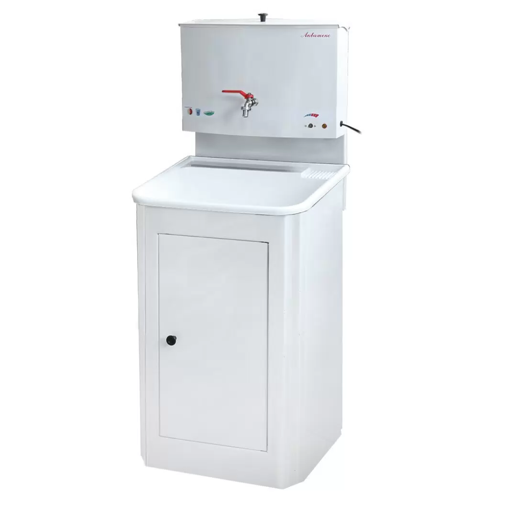 Конструкция умывальника составная: включает в себя тумбу, которая аккуратно скрывает способ слива воды и позволяет осуществлять водоотвод в канализацию или отдельную емкость и бак. Бачок умывальника оборудован электрическим водонагревателем.