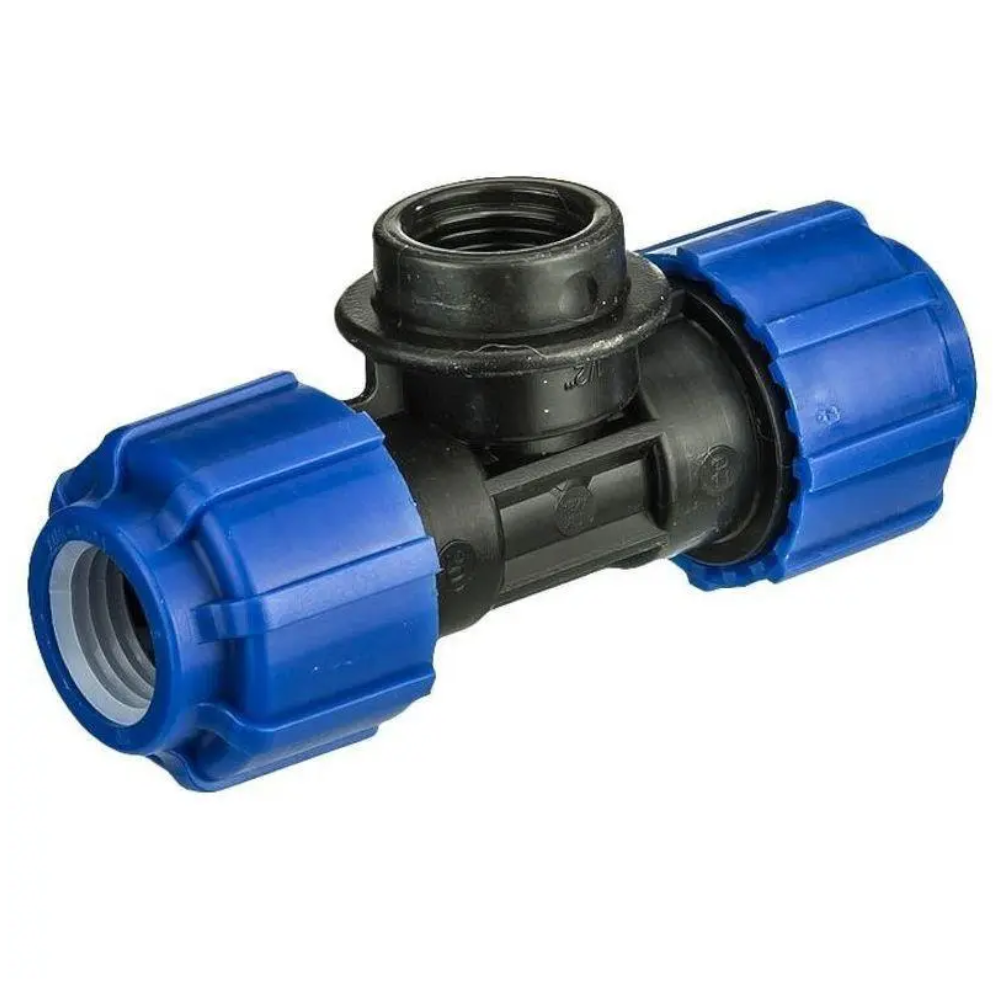 Тройник компрессионный с внутренней трубной резьбой является универсальной деталью полиэтиленового трубопровода имеющий внутреннюю резьбу с шагом, соответствующим стандартным размерам стальных труб, благодаря чему, этот тройник можно использовать для перехода с ПНД трубы на стальную и наоборот.