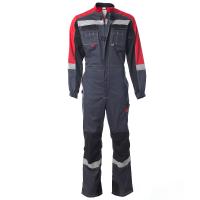 Застежка на молнию, закрытую ветрозащитной планкой на липучку. С фигурным воротником стойка. В области подмышечных впадин вентиляционные отверстия из сетки. Верхние накладные фигурные карманы с фигурными клапанами на липучку. Держатель полукольца для бейджа. С эластичной резинкой по талии спинки. Задними фигурными накладными карманами и карманами под инструменты. С накладным карманом и фигурным клапаном на липучку на боковом шве. Усилительными накладками в области коленей и по шаговому шву. В комбинезоне используется световозвращающая лента 50мм.