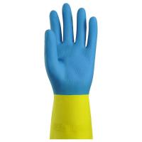 Двухцветные перчатки произведены из высококачественного латекса. Ромбовидная поверхность перчаток позволяет удерживать скользкие предметы.