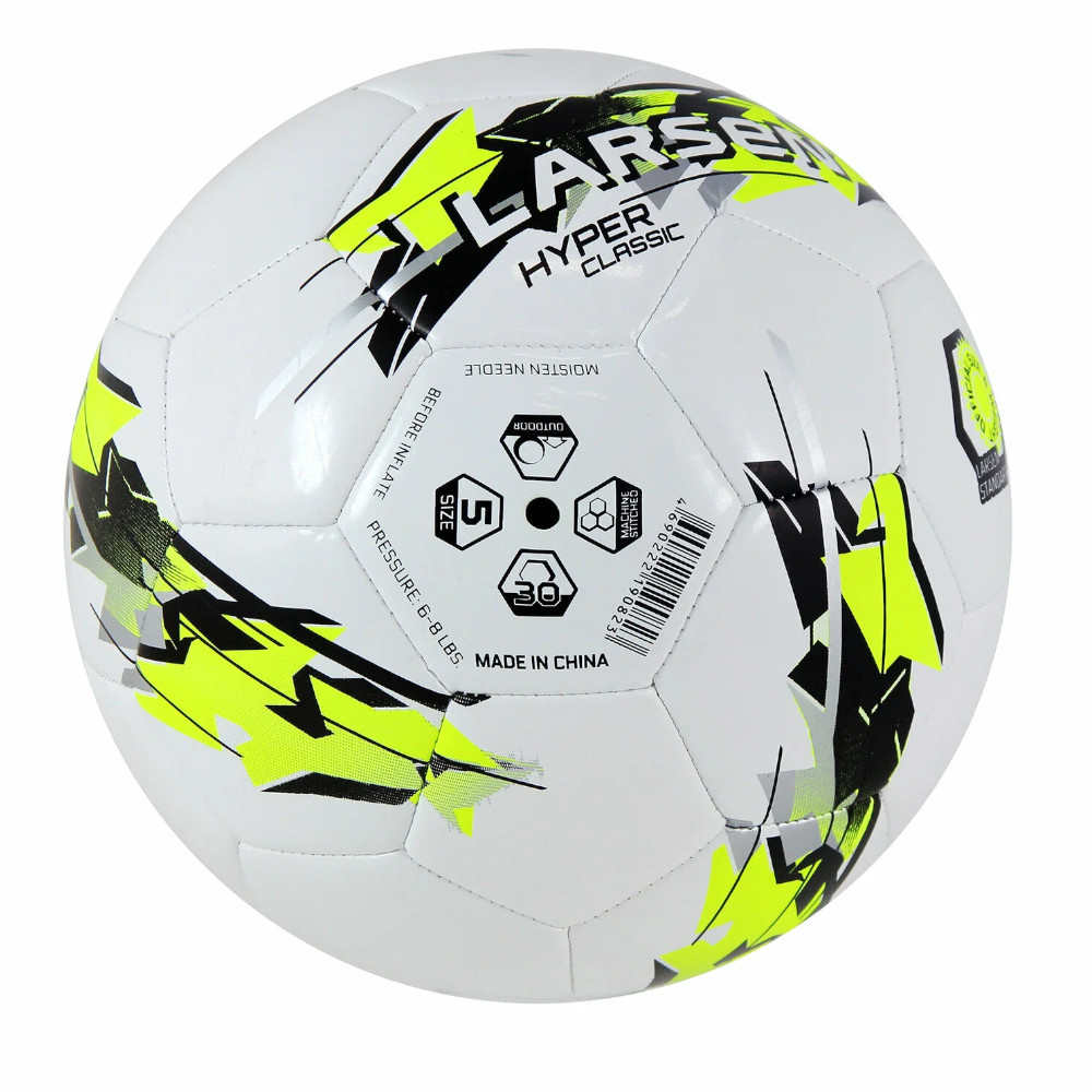 Отличный любительский мяч, для вашего старта в футболе. Этот мяч для футбола поможет вам оттачивать мастерство, улучшать технические и тактические навыки и приемы. Не важно, на каком покрытии вы предпочитаете играть, натуральный газон, паркет, искусственный газон или резина, мяч футбольный Larsen Hyper хорошо проявит себя на любой из перечисленных поверхностей. Мячи футбольные с ярким и динамичным дизайном и высококонтрастной графикой, как у Larsen Hyper, отлично читаются на различных покрытиях, что немаловажно при игре, как в классический, так и в мини-футбол. Мяч футбольный 5 размера изготовлен из 30 панелей, обеспечивающих равномерное вращение при полете, стабильность и контроль на поле. Внешние панели сшиты машинным способом. Внутри мяча находится камера, изготовленная из резины.