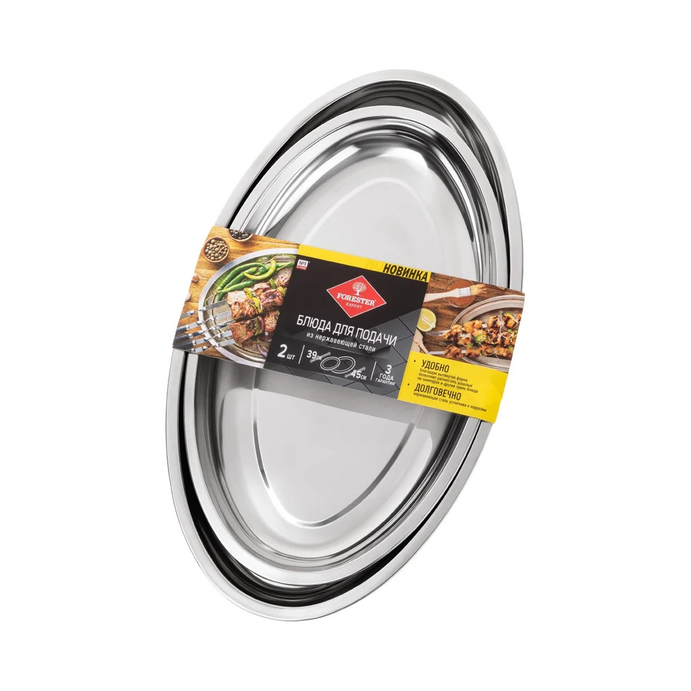 Набор блюд из нержавеющей стали 2шт (45 и 39см) FORESTER BC-901- благодаря вытянутой форме на блюдах можно разместить шашлык на шампурах и другие гриль-блюда.