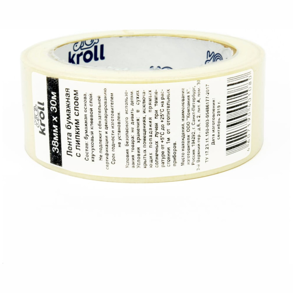 Малярная лента KROLL (крепп), 38 мм х 30 м 4607190401080 - это клейкая лента на бумажной основе со слабовыраженным гофром, с одной стороны на которую нанесен каучуковый клеевой слой. Предназначена для защиты поверхностей при проведении малярных, лакокрасочных и штукатурных работ, для защиты элементов корпуса автомобиля при проведении малярных и лакокрасочных работ, для запечатывания легких коробок, для мелкого ремонта книг, карт, плакатов и т.д.