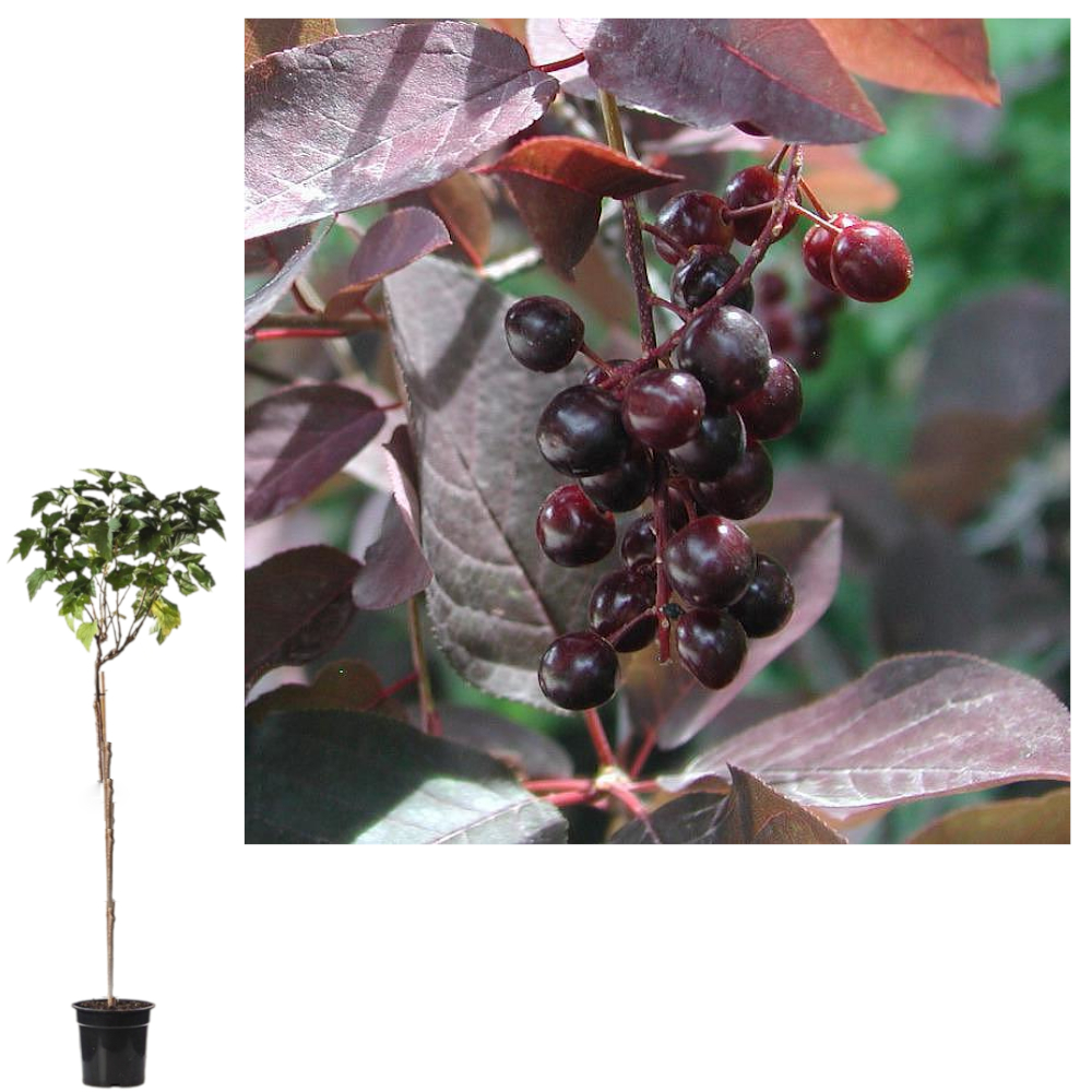 Черемуха виргинская ‘Шуберт’ (Prunus virginiana ‘Shubert’) – компактное дерево или кустарник с разветвленной кроной, украшенный необычным цветом листьев-хамелеонов: весной они зеленые, летом – красновато-фиолетовые или темно-пурпурные, а осенью – красно-бордовые. Скорость роста быстрая, прирост может составлять 60 – 100 см в год. Высота взрослого растения достигает 4-6 м, ширина 2 – 3 м. Крона пирамидальная, ветви густо разветвленные. Кора темно-коричневая, мелкотрещиноватая. Листья декоративные, весной зеленые, летом меняют окраску на темно-пурпурную, которая сохраняется даже при выращивании в полутени. Период цветения начинается в мае. Цветки белые, многочисленные, собраны в кистевидные поникающие соцветия, без запаха. Плоды- черно-бордовые, мелкие ягоды, съедобные. Созревают в середине августа. Черемуха виргинская Шуберт к почвам малотребовательна, но предпочитает влажные, богатые основы.