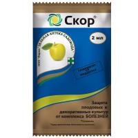 Препарат Скор - системный фунгицид для защиты плодовых, декоративных и овощных культур от комплекса болезней. Назначение: для защиты яблони от парши, монилиального ожога, альтернариоза, винограда от оидиума, черной гнили, фомопсиса, краснухи, томата, моркови и картофеля - от альтернариоза, томатов, моркови и картофеля - от альтернариоза. Быстро проникает в ткани растения и не смывается дождем уже через 2 часа, очень активен в теплую влажную погоду наиболее благоприятную для заражения паршой, длительное действие позволяет сократить число обработок, исключительно благоприятно влияет на растения, увеличивает прирост.