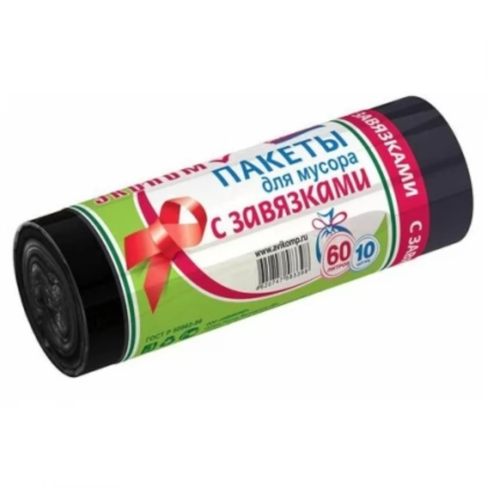 ПАКЕТЫ ДЛЯ МУСОРА С ЗАВЯЗКАМИ "ЭКОНОМ" 60 Л, РУЛОН 10 ШТ. (ЧЕРНЫЕ) 14 МКМ (1/30) "AVIKOMP"