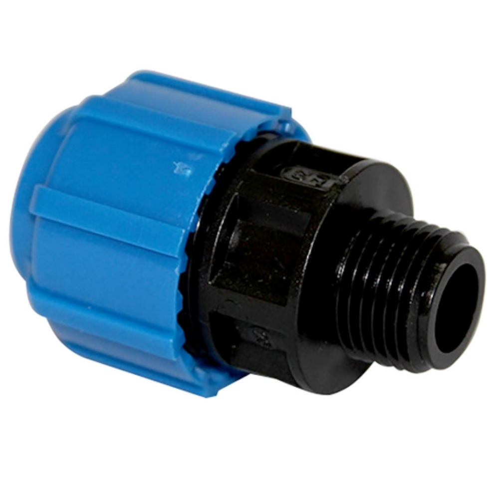 Муфта компрессионная с наружной трубной резьбой предназначена для возможности легкого перехода со стального трубопровода на трубопровод из ПНД труб, так как имеет резьбу соответствующую размерам и стандартам стальных трубных резьб. Кроме этого муфта компрессионная с наружной резьбой может учавствовать в строительстве различных комбинаций отводов и разветвлений с применением других компрессионных ПНД фитингов.
