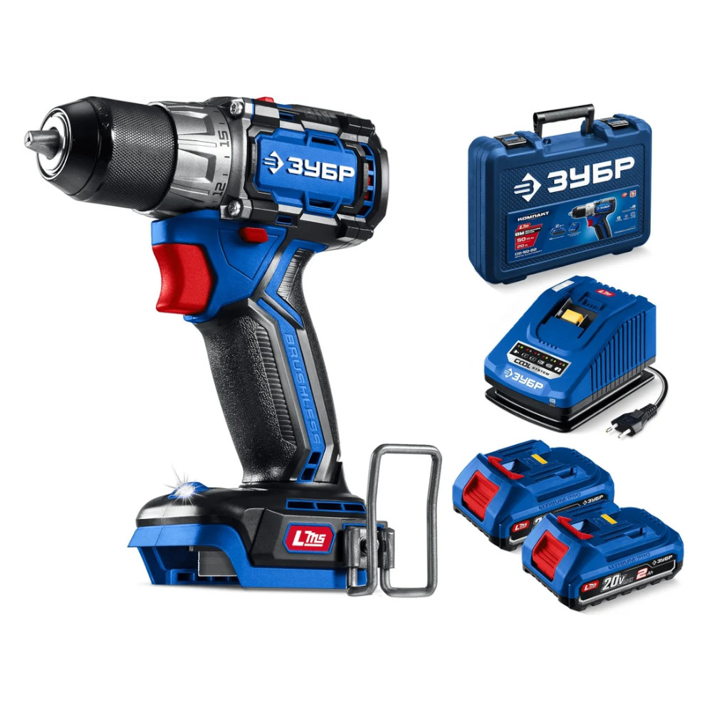 Дрель-шуруповерт бесщеточная, кейс, ПРОФЕССИОНАЛ ЗУБР КОМПАКТ #2 20 В, 50 Н·м, 2 АКБ LMS (2 А·ч)