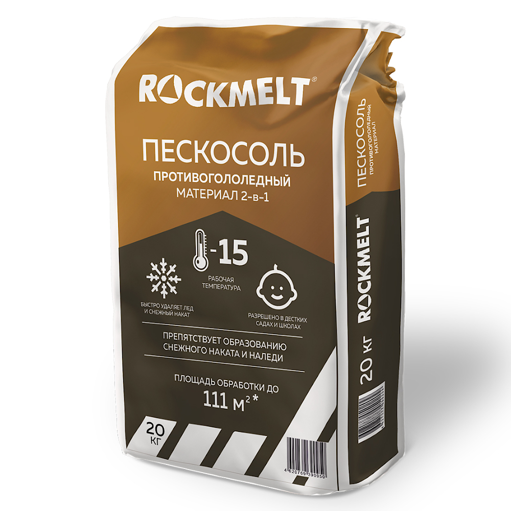 АНТИГОЛОЛЕД "ROCKMELT" ПЕСКОСОЛЬ 20 КГ предназначен для борьбы с зимними ледяными образованиями. Используется для обработки пешеходных зон и тротуаров с твердым покрытием, площадей, дворов, автомобильных дорог, платформ. Соль разрушает лед и снежный накат. Песок мгновенно предотвращает скольжение.