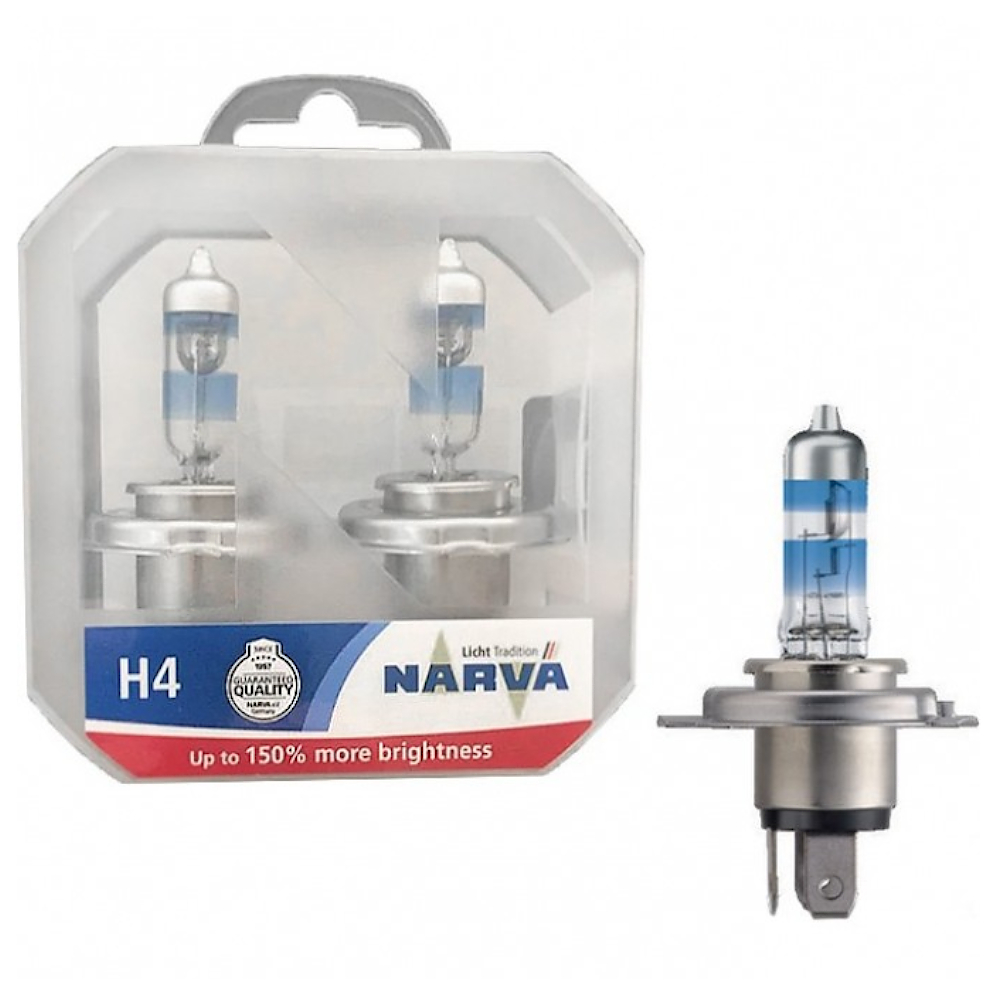 Самые яркие галогенные лампы нового поколения от производителя Narva серии Range Power 150 с увеличенной на 150% яркостью позволяют лучше распознавать препятствия и опасности на дороге и поэтому значительно увеличивают запас времени для совершения маневра по сравнению со стандартными галогенными лампами. Этот комплект включает в себя 2 источника света, которые относятся к категории Н4 с цоколем Р43t и упакованы в пластиковый бокс. Изделия имеют по две нити накаливания и предназначены для головного освещения легковых автомобилей с бортовым напряжением 12 Вольт. Номинальная потребляемая мощность спиралей составляет 55 и 60 Ватт. Благодаря инновационным лазерным технологиям этот комплект автоламп обеспечивает до 150% больше яркости, если сравнивать с минимальными установленными требованиями, а тщательно продуманная структура нитей накала позволяет добиться дополнительной светоотдачи. Световой луч моделей до 150 м длиннее, а излучаемый свет до 20% белее, по сравнению с требованиями, предусмотренными стандартом. Цветовая температура устройств достигает 3500 Кельвинов. Это идеальный выбор для всех, кто понимает, какое значение на дороге имеет яркий свет и безопасность движения.