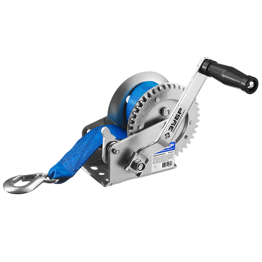 Ручная барабанная, ленточная лебедка ЗУБР - легкая, компактная, надежная лебедка для перемещения грузов будет незаменимым помощником. Крюк изготовлен из специальной неломкой стали. Увеличенный диаметр барабана.