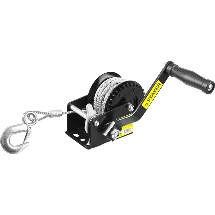 Ручная барабанная лебедка Stayer MASTER 0,45т, 8м 43112-0.5 оснащена тросом длиной 8 м и крюком, с помощью которого груз закрепляется и перемещается. Конструкция обладает рукояткой для наматывания троса на барабан. Лебедка удобна для проведения ремонтных и строительных работ. Крюк оснащен предохранительной защелкой, он выполнен из углеродистой стали.