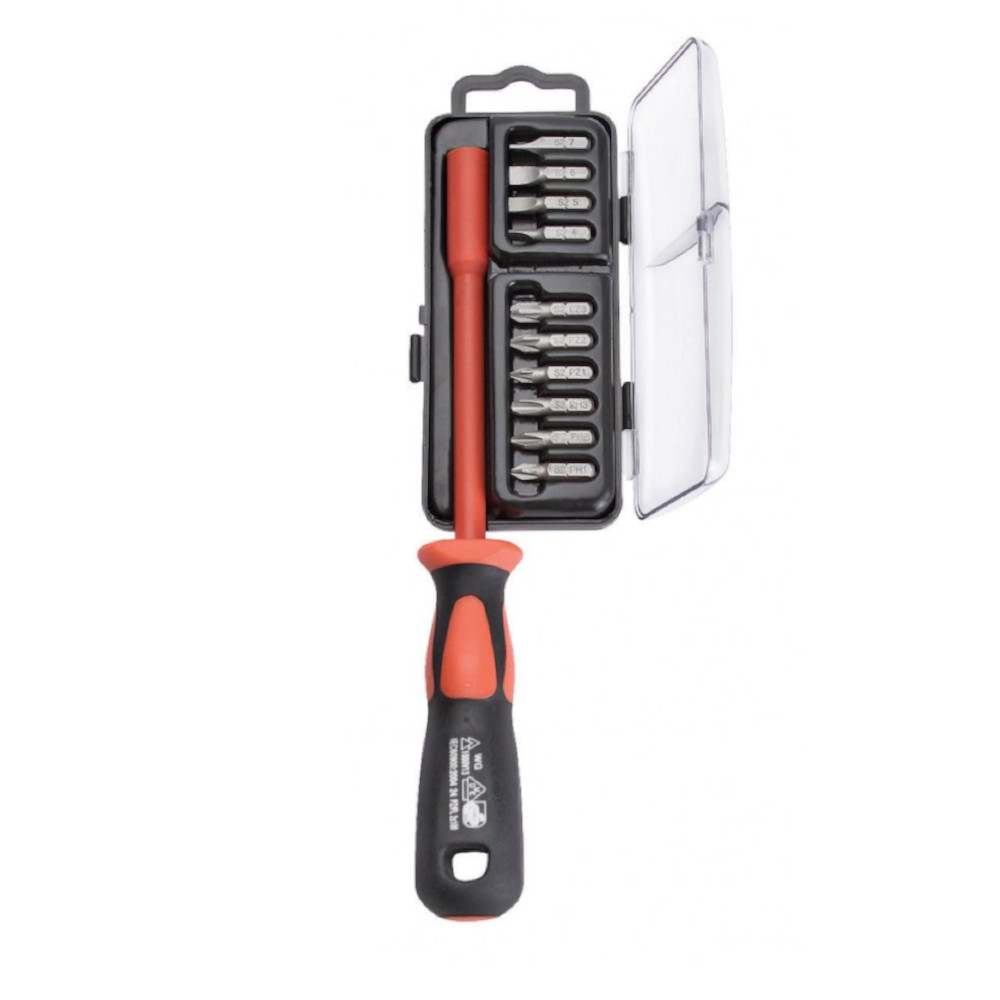 Биты набора изготовлены из хромомолибденовой стали. Стержень отвертки имеет диэлектрическое покрытие и двухкомпонентную рукоятку. Набор поставляется в пластиковом кейсе.
