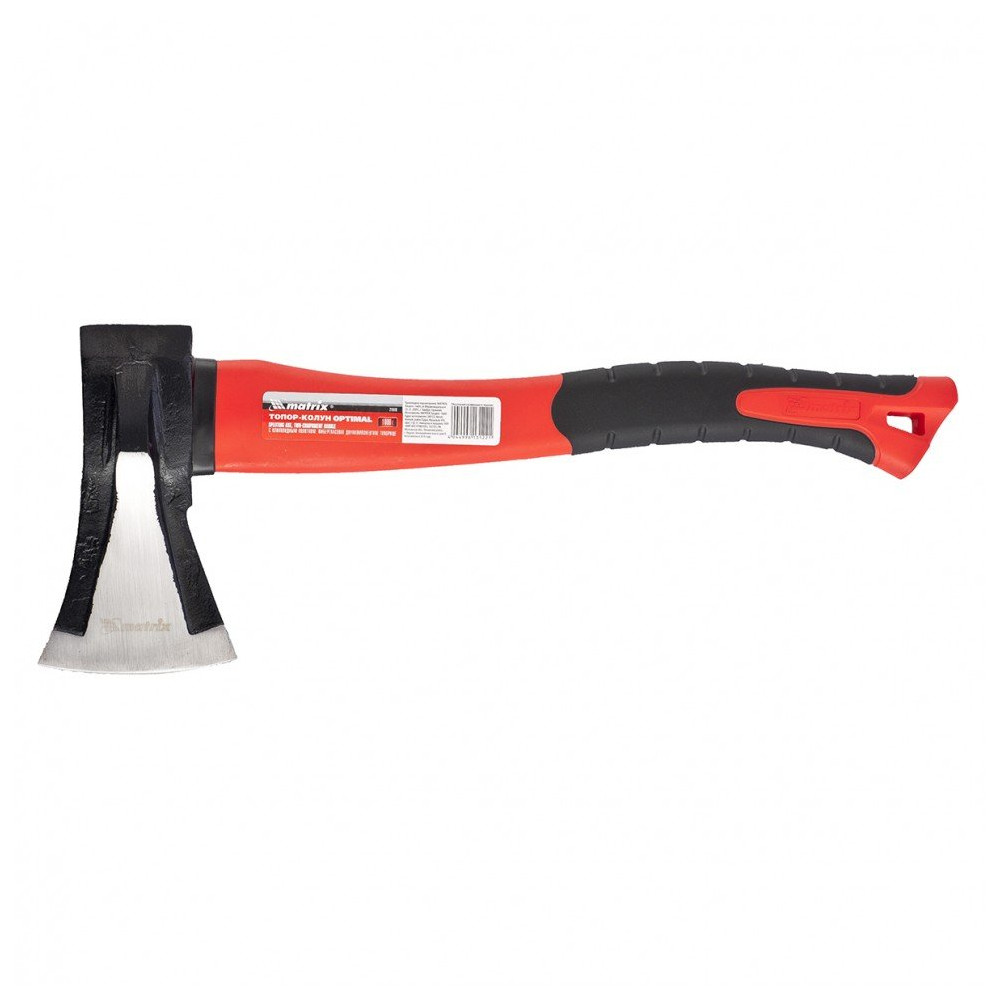 Топор-колун''optimal''с клиновид.полотном 1000г,фиберглас.двухкомп.топорище 400мм// Matrix озволяет не только колоть, но и рубить древесину. Утолщенная по бокам рабочая часть позволяет легко раскалывать бревна и заготовки. Инструмент пригодится профессионалу и частному мастеру.ПреимуществаВысокая прочность — полотно выковано из стали 45, топорище изготовлено из фибергласа.Износостойкость — режущая кромка закалена до твердости 48–50 HRC и долго сохраняет остроту.Отверстие в рукоятке — можно дополнительно использовать шнурок, чтобы колун не выпадал из рук при работе.Комфортная работа — резиновые накладки на топорище поглощают колебания от ударов и обеспечивают надежный хват.Компактность — топор-колун легко помещается в сумку, что позволяет брать его с собой в походы.