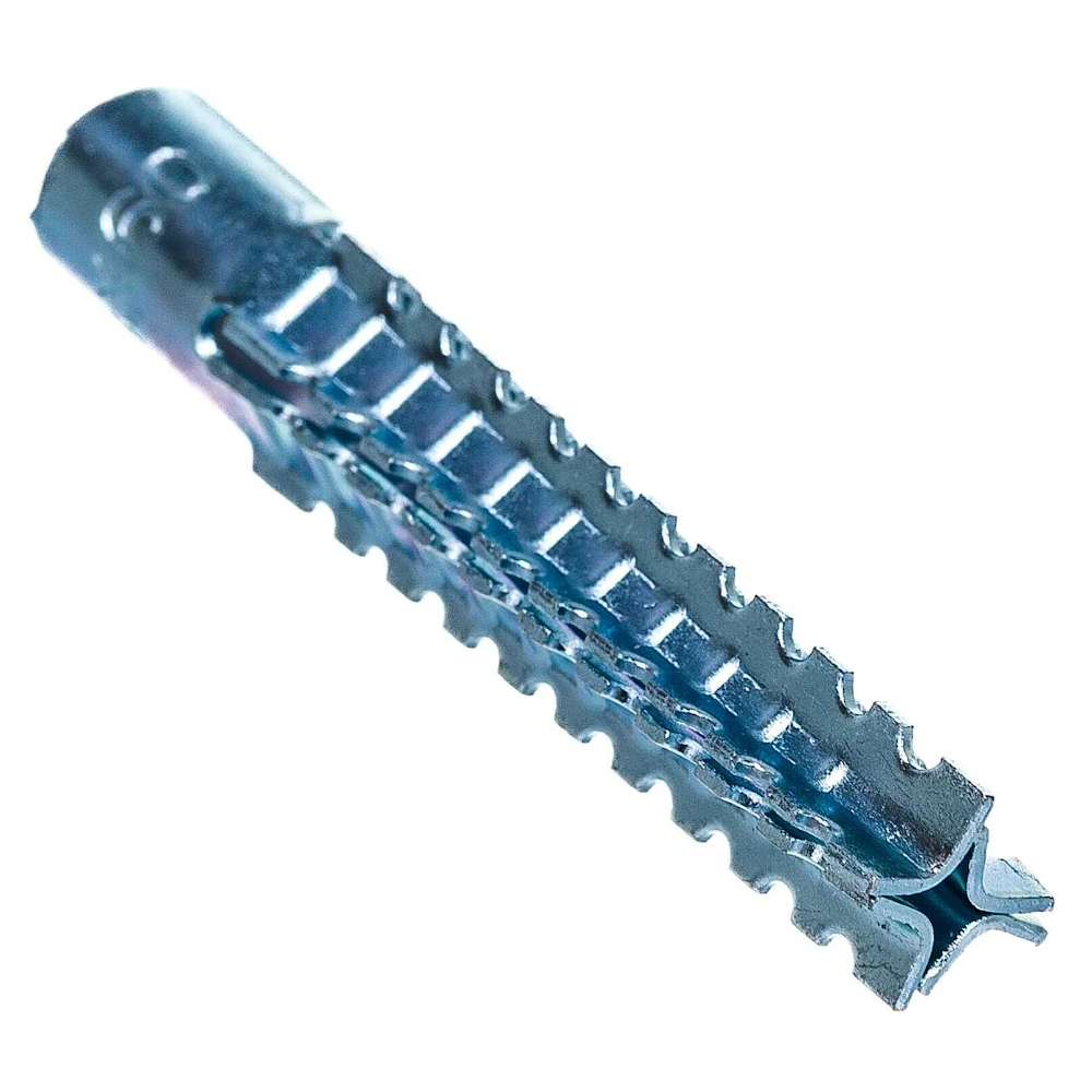Верхняя часть дюбеля имеет вид трубки, которая является основанием, а нижняя часть имеет четыре сегмента с явно выраженными шипами. При монтаже в газобетон или пенобетон можно предварительно не подготавливать отверстие, а крепить дюбель с помощью молотка.