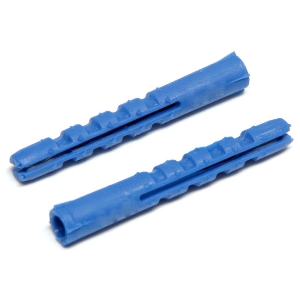 Дюбель пластмассовый длиной 40 мм диаметром 5 мм используется совместно с саморезами и шурупами диаметром 3–3,5 мм и длиной не менее 45 мм плюс толщина закрепляемого материала.