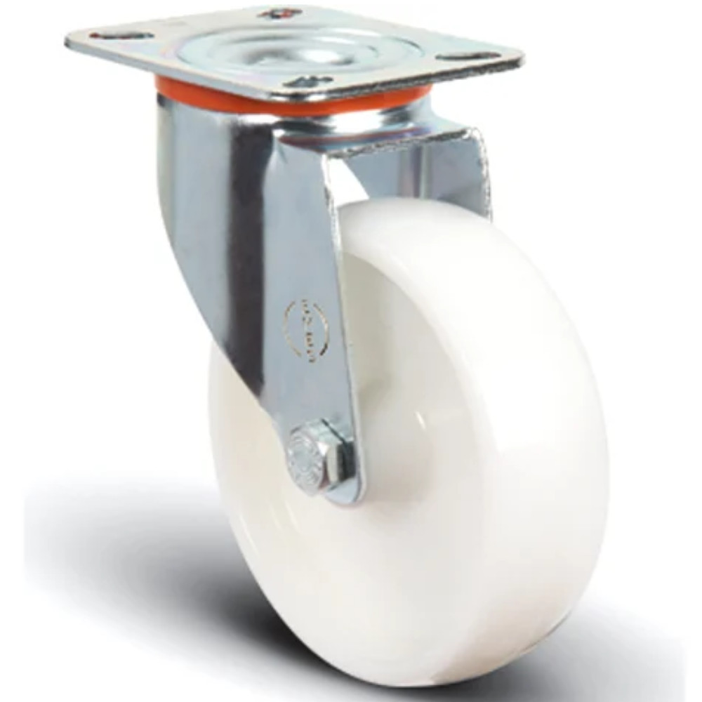 Колесо нейлоновое поворот.100мм - опора колесная устанавливается на платформенные тележки для пищевой промышленности, медицинское оборудование и технику. Обод из нейлона хорошо распределяет нагрузку и обеспечивает устойчивость. Грузоподъемность 0.14 т.