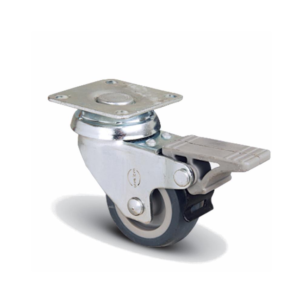 Поворотный кронштейн из оцинкованной стали с тормозом. Тип крепления — площадка. Двойной шарикоподшипник в поворотном узле. Обод из полипропилена, шинка из термопластичной серой резины, в ступице подшипник скольжения, крепление на ось. Размер платформы 50x50 мм. Межосевой размер 38x38 мм. Ширина обода 20 мм. Нагрузка 35 кг.