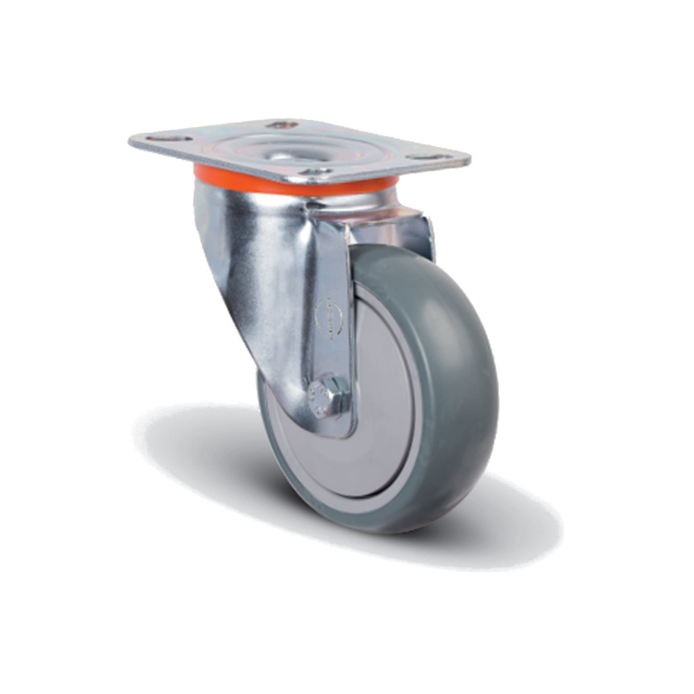 Аппаратное поворотное колесо с платформенным креплением и тормозом ЕM01 MBT 80 F. Обод колеса полипропиленовый, шинка колеса из термопластичной серой резины. Колеса предназначены для перевозки разных грузов внутри помещений с хорошими полами. Используются колеса в медицинских учреждениях, заводах, гостиничных комплексах, супермаркетах, столовых, торговых залах и не оставляют следов на полах