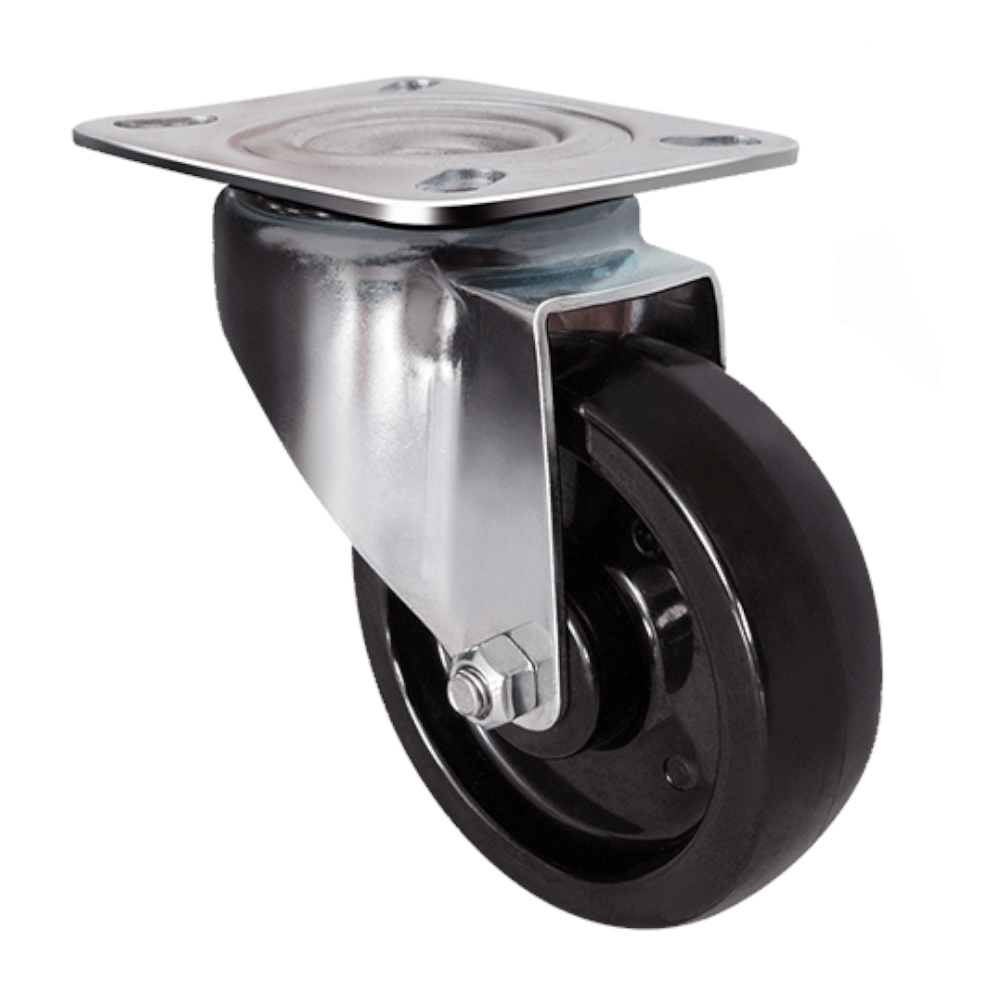 Колесо имеет увеличенную износостойкость за счет минимального трения при движении. Основой конструкции является подшипник скольжения, заполненный термопастой. Поворотный механизм с платформой изготовлен из стали с двойным оцинкованным слоем. Движущаяся часть представляет собой цельнолитую конструкцию из специального полимера – фенолпласта, сочетающего в себе прочность и пластичность.