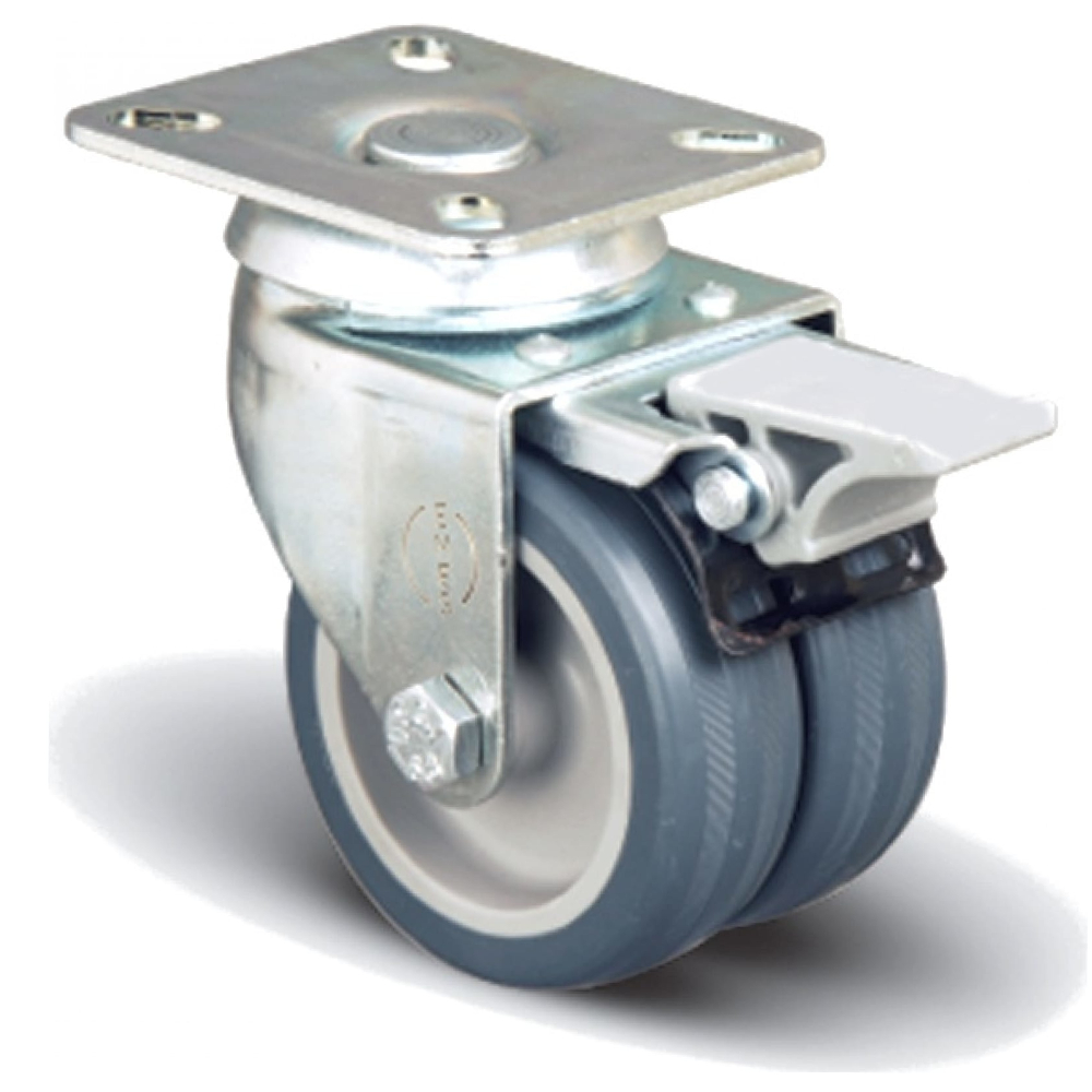 Сдвоенное колесо аппаратной серии обеспечивает хорошую устойчивость. Обод из прочного полипропилена с защитными колпаками, шинка из серой резины. Диаметр 50 мм, высота колесной опоры 77 мм. Размер платформы 65x65 мм, межосевой размер 47x47 мм. Шинка из литой аппаратной резины не пачкает полы, тихо катится по любой поверхности. Ножной тормоз обеспечивает неподвижность во время стоянки. Подходит для медицинской мебели и оборудования, аппаратуры, реабилитационных кроватей и каталок. Грузоподъёмность модели 55 кг.