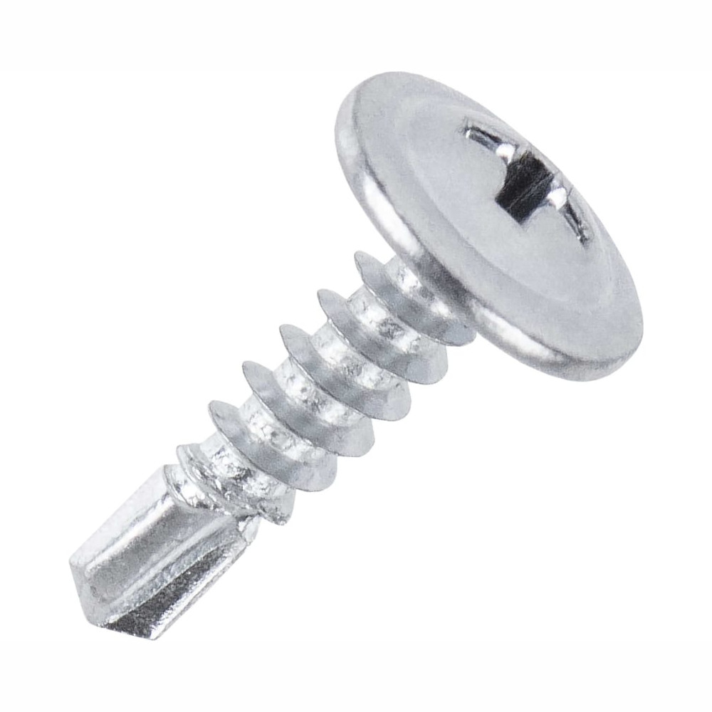 Саморезы с прессшайбой используют для крепления тонколистовых элементов. Острый до 0,9 мм, со сверлом до 2,0 мм. Монтаж при помощи шуруповерта с битой PH2