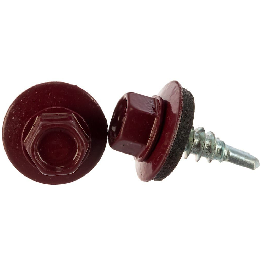 Саморез кров. сверло 4,8х19 RAL 3005 винно-красный применяются для фиксации металлических материалов к поверхностям из дерева или металла. Саморез имеет шестигранную головку с резиновой прокладкой. Она даёт защиту от попадания влаги под крепёж. Окраске подвергается только головка и верхняя часть шайбы. На конце кровельного самореза сверло, которое может просверлить металл толщиной до 6 мм и не сломаться.