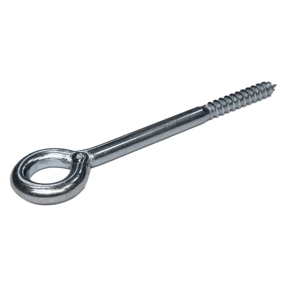 Саморез изготавливается из стали марки 4.8 с последующим оцинковыванием. Визуально представлен стержень со сварным кольцом и резьбой на 1/3 длины стержня. У данного самореза кольцо сварное, что защищает крепеж от самораскрытия проушины и позволяет выдержать более тяжелые весовые нагрузки