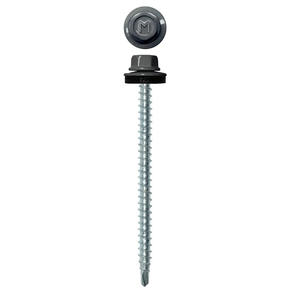 Саморез кровельный Daxmer 4,8х70 RAL 7024 применяется для фиксации металлических материалов к поверхностям из дерева или металла. Саморез имеет шестигранную головку с резиновой прокладкой. Она даёт защиту от попадания влаги под крепёж. Окраске подвергается только головка и верхняя часть шайбы. На конце кровельного самореза сверло, которое может просверлить металл толщиной до 6 мм и не сломаться.