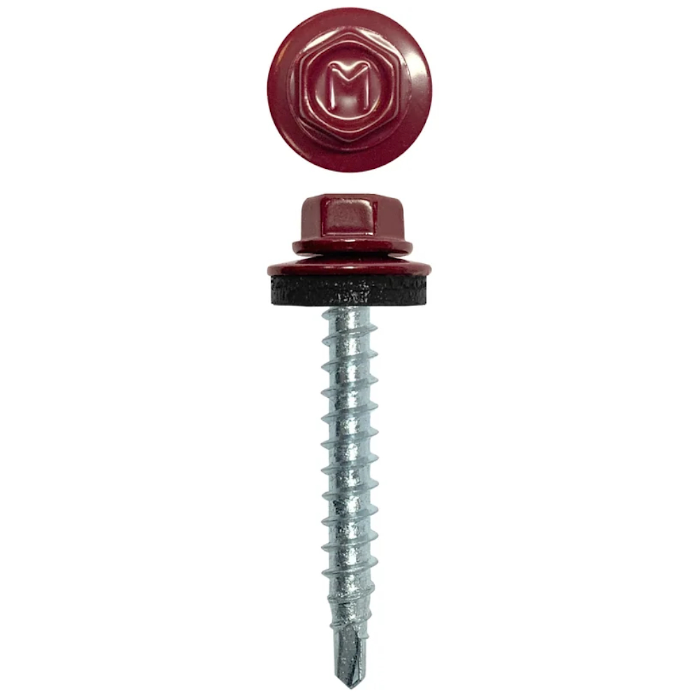 Саморез по металлу Daxmer представляет собой крепежное соединение, которое благодаря EPDM-уплотнителю плотно фиксирует кровельный лист к деревянной или металлической обрешетке, а также защищает от проникновения влаги под полотно. Изделие изготовлено из стали и окрашено порошковой краской в винно-красный цвет.