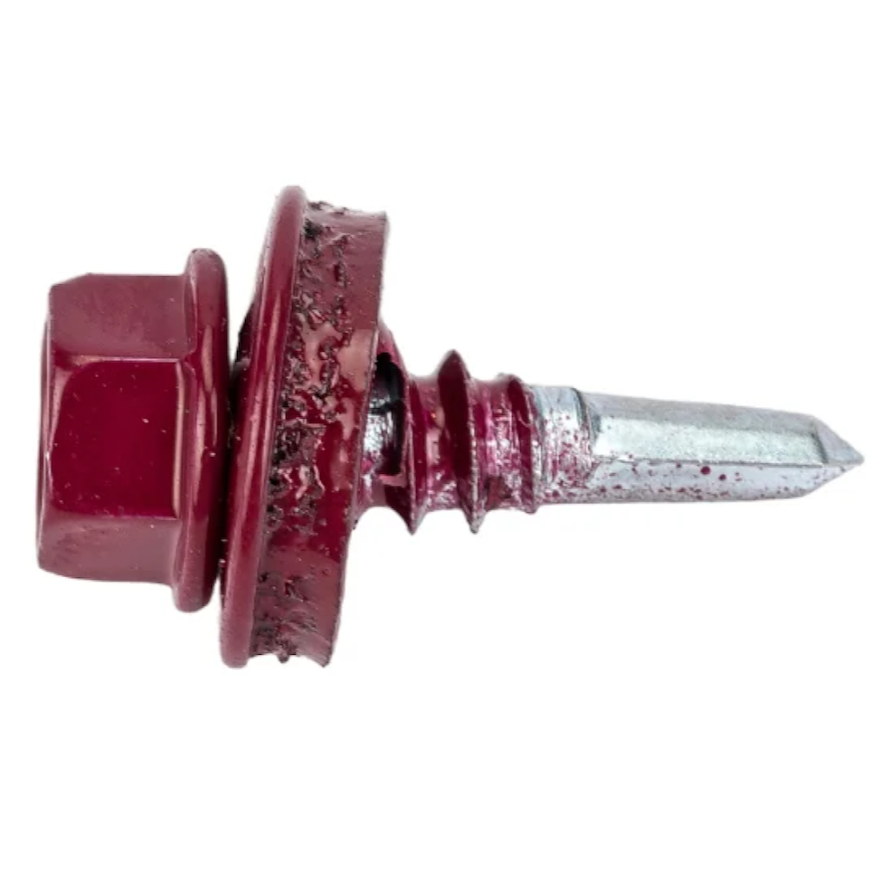 Саморез по металлу Daxmer представляет собой крепежное соединение, которое благодаря EPDM-уплотнителю плотно фиксирует кровельный лист к деревянной или металлической обрешетке, а также защищает от проникновения влаги под полотно. Изделие изготовлено из стали и окрашено порошковой краской в винно-красный цвет.