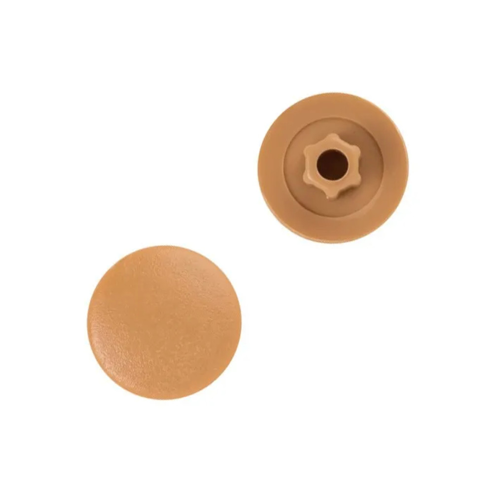 Наружная пластиковая заглушка цвета бук имеет круглую форму диаметром 13 мм, выступающую над поверхностью плиты на 2 мм и служит для скрытия шляпки конфирмата или минификса на мебельных деталях. Колпачок устанавливается путем вдавливания в шуруп и надежно удерживается в отверстии за счет шестигранной ножки высотой 3 мм.