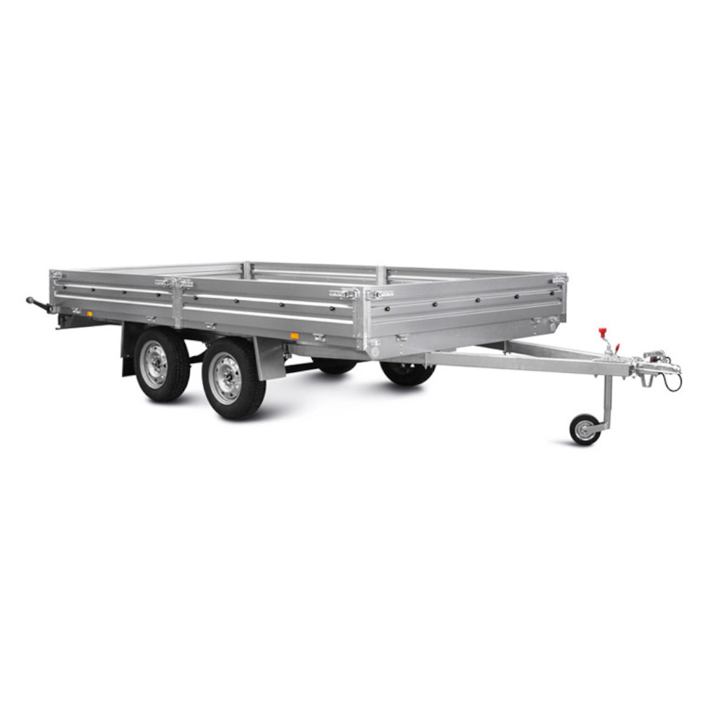 Оцинкованное V-образное дышло выдерживает сильные динамические нагрузки. Оно выполнено из замкнутого стального профиля, что повышает его надёжность и позволяет уберечь жгут электропроводки от внешних повреждений. Оцинкованная стальная рама собрана на болтовых соединениях, что существенно надёжней сварного исполнения и обеспечивает лёгкую замену деталей в случае их механических повреждений. Дно прицепа выполнено из многолистовой ламинированной фанеры с противоскользящим покрытием. Устойчиво к износу и воздействию влаги. Боковины дна платформы выполнены из оцинкованной стали и оборудованы петлями крепления груза (6 шт.). Откидные борта дают возможность осуществлять загрузку и выгрузку с любой стороны платформы. Они выполнены из оцинкованного стального листа (толщина 1,5 мм) с дополнительной штамповкой рёбер жёсткости. Рёбра жёсткости позволяют повысить устойчивость бортов к динамическим/ударным нагрузкам. Борта и стойки бортов — съёмные. Рессорная подвеска (4 рессоры по 4 листа) с гидравлическими амортизаторами сохраняет стабильную плавность хода при разной загруженности прицепа. Каждая ось рассчитана на нагрузку 750 кг, ступицы оборудованы защитными колпаками, подшипники не требуют дополнительной смазки и регулировки на протяжении всего срока службы. Производство AL-KO Kober (Германия). Ходовая часть прицепа крепится к специальному силовому подрамнику, который принимает на себя основные ударные нагрузки во время езды и повышает надёжность конструкции. Светотехника с герметичными байонетными разъёмами. Жгут электропроводки убран в защитный гофрированный кожух. Штекер 7-pin. Антикоррозийное покрытие горячим цинкованием существенно эффективнее цинкового напыления или краски. Оно создаёт надёжную защиту от коррозии как внешних поверхностей, так и внутренних полостей конструкции, значительно продлевая срок службы прицепа.